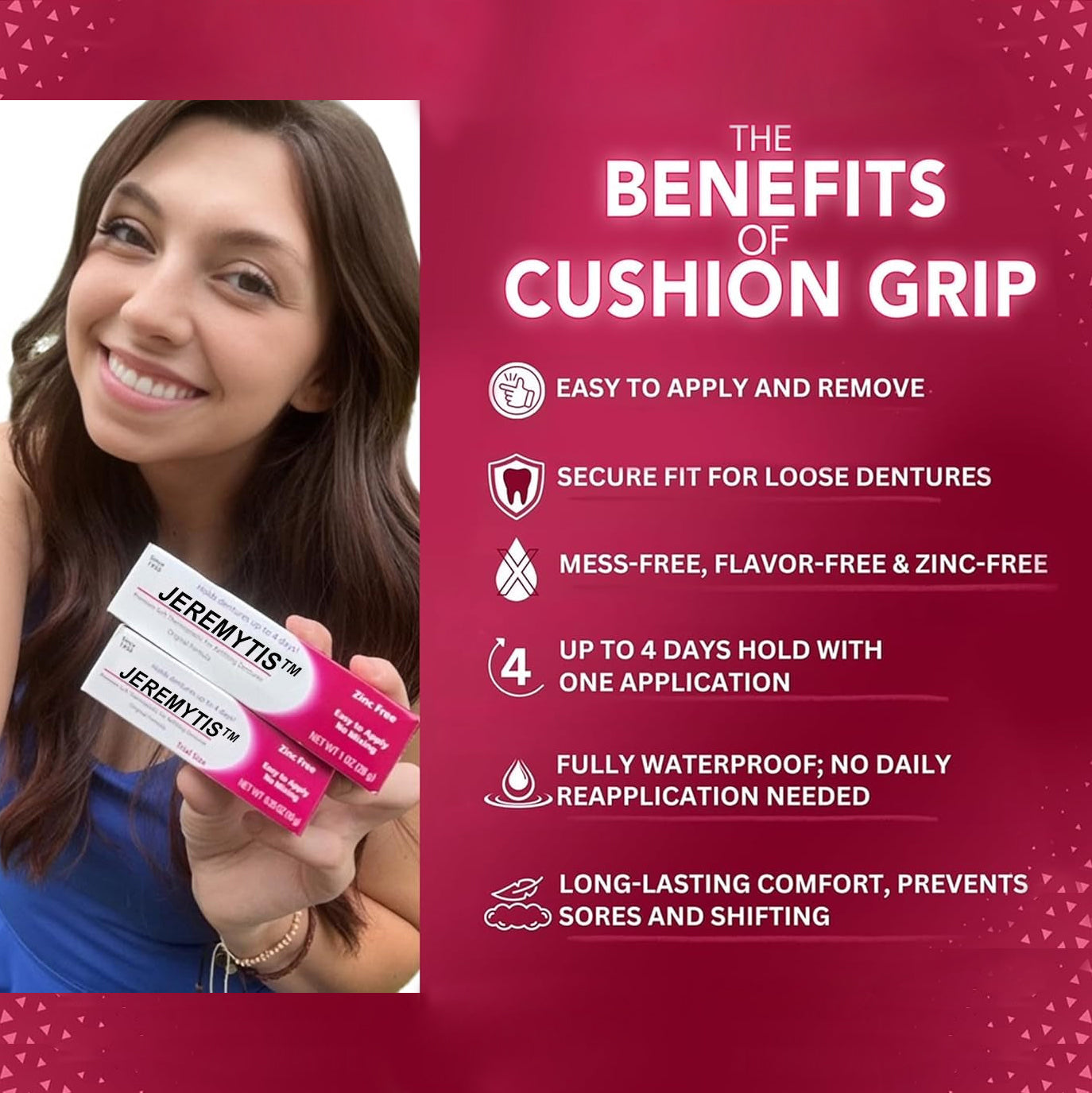 "JEREMYTIS™ has truly transformed my daily life! Now I can enjoy my meals and smile all day without denture pain."--Lily Hall