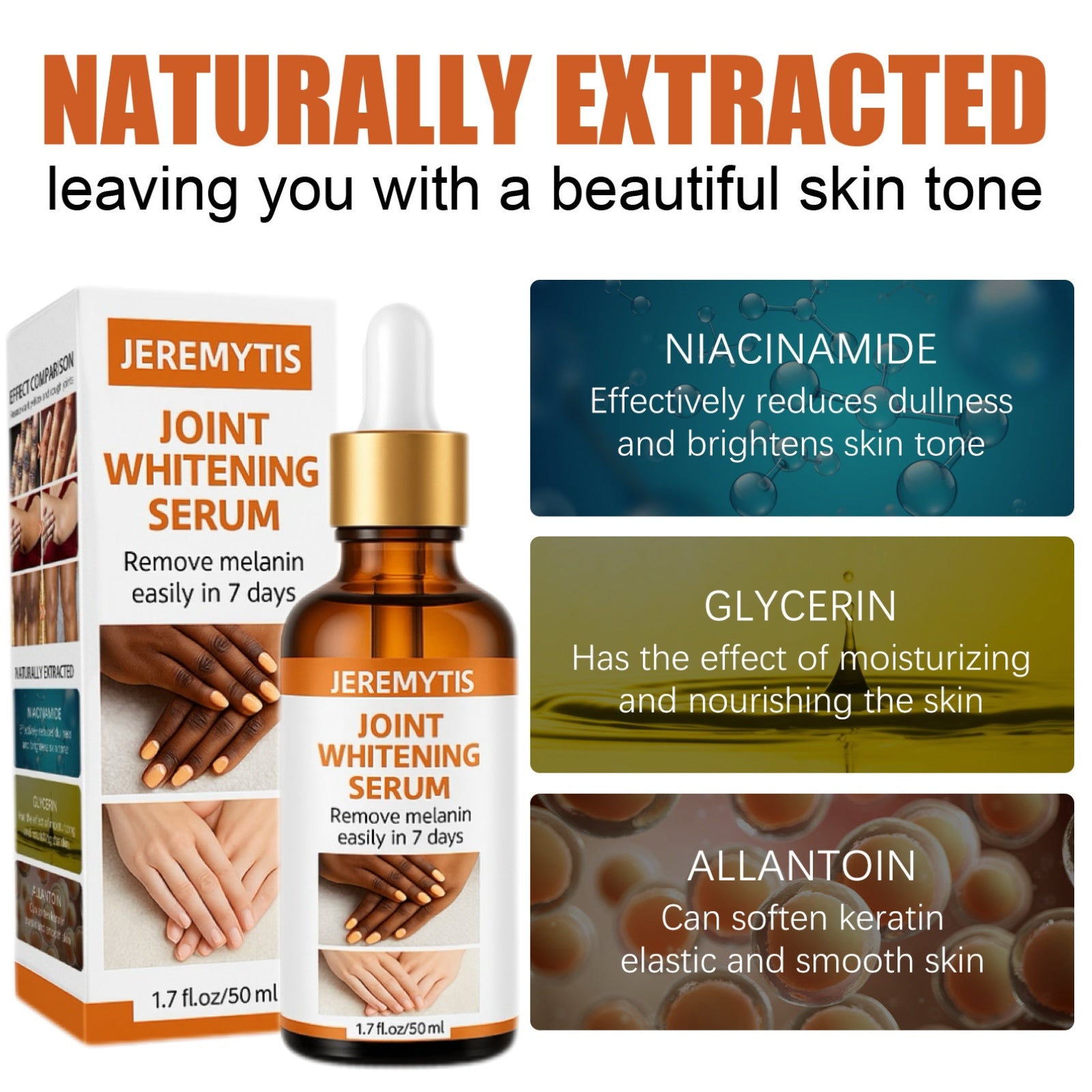 Joint Whitening Serum is specially designed for fingers, knees, elbows, and more. Its fast-acting formula visibly fades dark spots in just 7 days. Triple brightening technology works deep to block melanin, break down existing pigmentation, and boost skin renewal for a natural, radiant glow — not just on the surface, but from within.