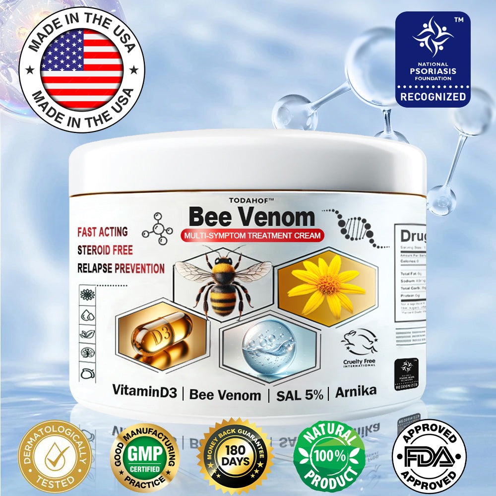Bee venom is rich in bioactive compounds like melittin, apamin, and adolapin, which have been scientifically shown to reduce inflammation byΒ inhibiting inflammatory pathwaysΒ and improve blood circulation to affected areas,Β delivering nutrients vital for skin repair.Β Regular use of this cream can effectively soothe chronic skin conditions like eczema, psoriasis, and rosacea, promoting smoother, healthier skin naturally.
