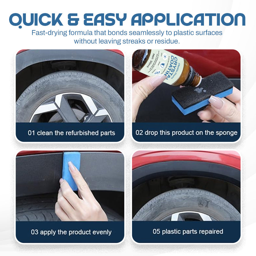 Say goodbye to tedious maintenance! Our automotive plastic coating solution is incredibly easy to use. In just four steps, you'll have your car's plastics looking brand new: